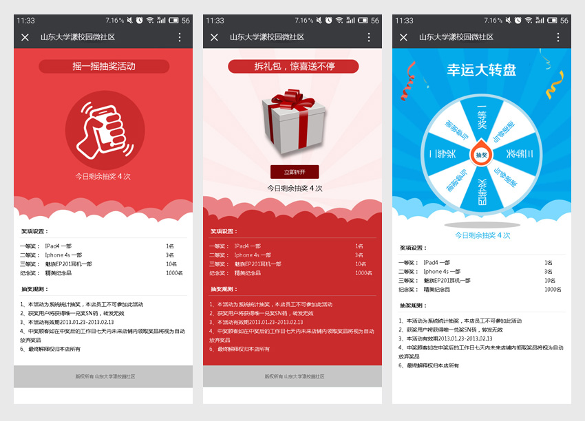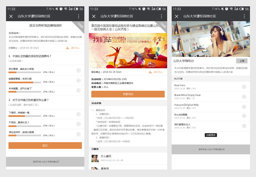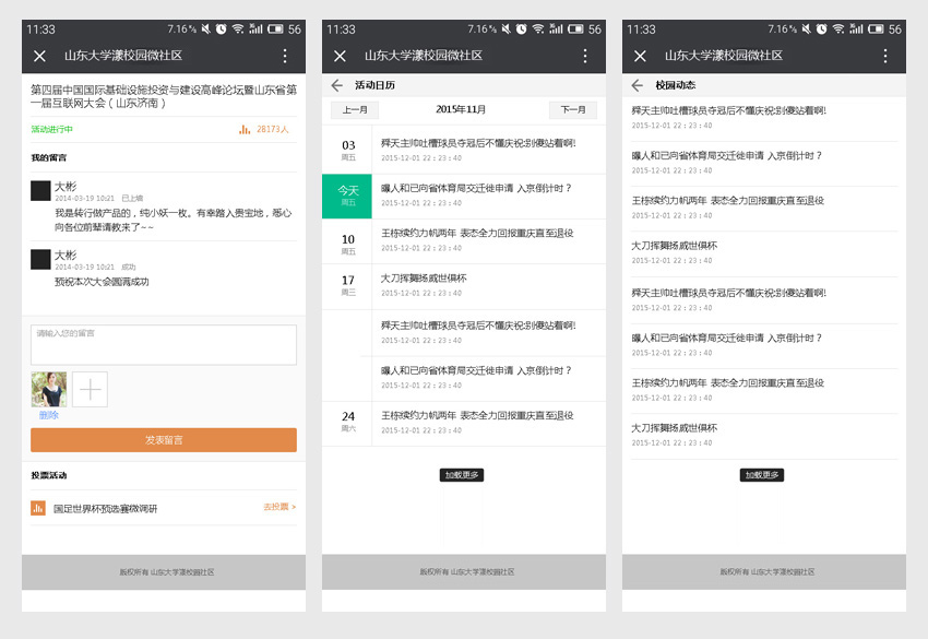 漾校園是我公司為客戶定制研發(fā)的,一套基于微信的第三方公眾賬號運(yùn)營平臺,平臺包含管理后臺、校園大使代理平臺以及官方網(wǎng)站,以下為本項(xiàng)目微信端的部分展示頁面