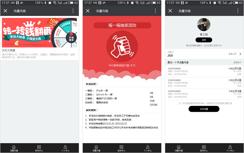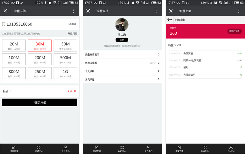微信流量充值,可自動(dòng)為聯(lián)通、電信、移動(dòng)手機(jī)流量充值,用戶可在為心內(nèi)簽到,簽到積分可以直接購(gòu)買流量,同時(shí)每天可以參與大轉(zhuǎn)盤(pán)活動(dòng)