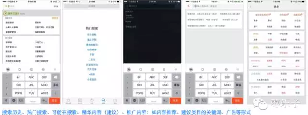 3、用戶不知道自己想要什么,通過 “搜索” 啟發(fā)自己靈感。因?yàn)楹芏鄳?yīng)用的搜索頁面中往往有 “精心安排” 的信息。為迎合這類用戶需求,搜索頁面一般有熱門搜索的關(guān)鍵詞、搜索類目、記錄等等。