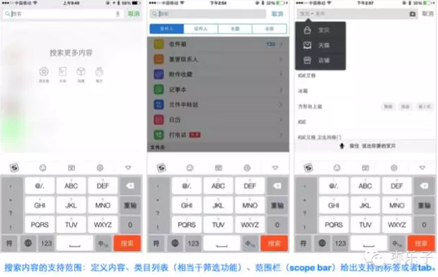 2)搜索內(nèi)容的支持范圍:定義內(nèi)容、類目列表、范圍欄(scope bar)給出支持的標(biāo)簽或者 tab。其目的是讓用戶明確 “搜索” 支持的范圍,相當(dāng)于搜索的 tips,有時(shí)候 “篩選” 功能會(huì)在該頁配合搜索一起使用。(見圖三)