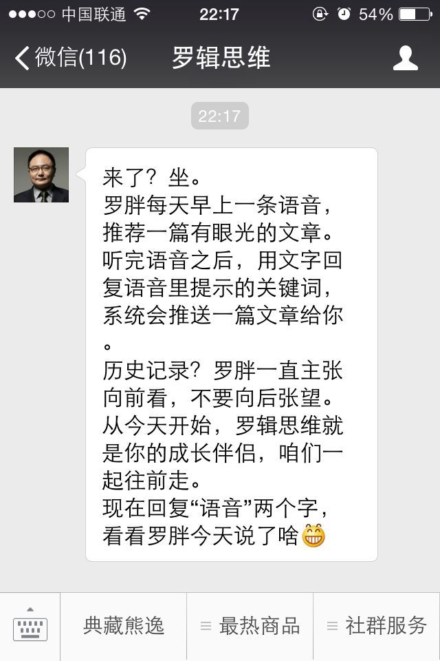 羅輯思維和之前的很多案例一樣,告訴了用戶,關注我可以提供什么服務。此外,估計很多人反饋想通過菜單或者關鍵詞看歷史記錄,最后他們直接在自動回復之中告訴大家:別反饋了,不推薦看歷史記錄。