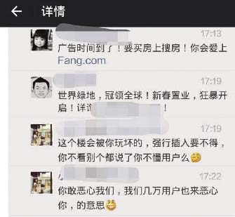比如,你不小心手滑在這條廣告下面點了贊,此后你好友參與的內(nèi)容都會刷爆你,如果不幸加了大量營銷達人,你會收到很多諸如“要買房上XX,你會愛上”“世界XX,冠領(lǐng)全球,新春置業(yè),狂暴開啟,詳情請點XXX”……
